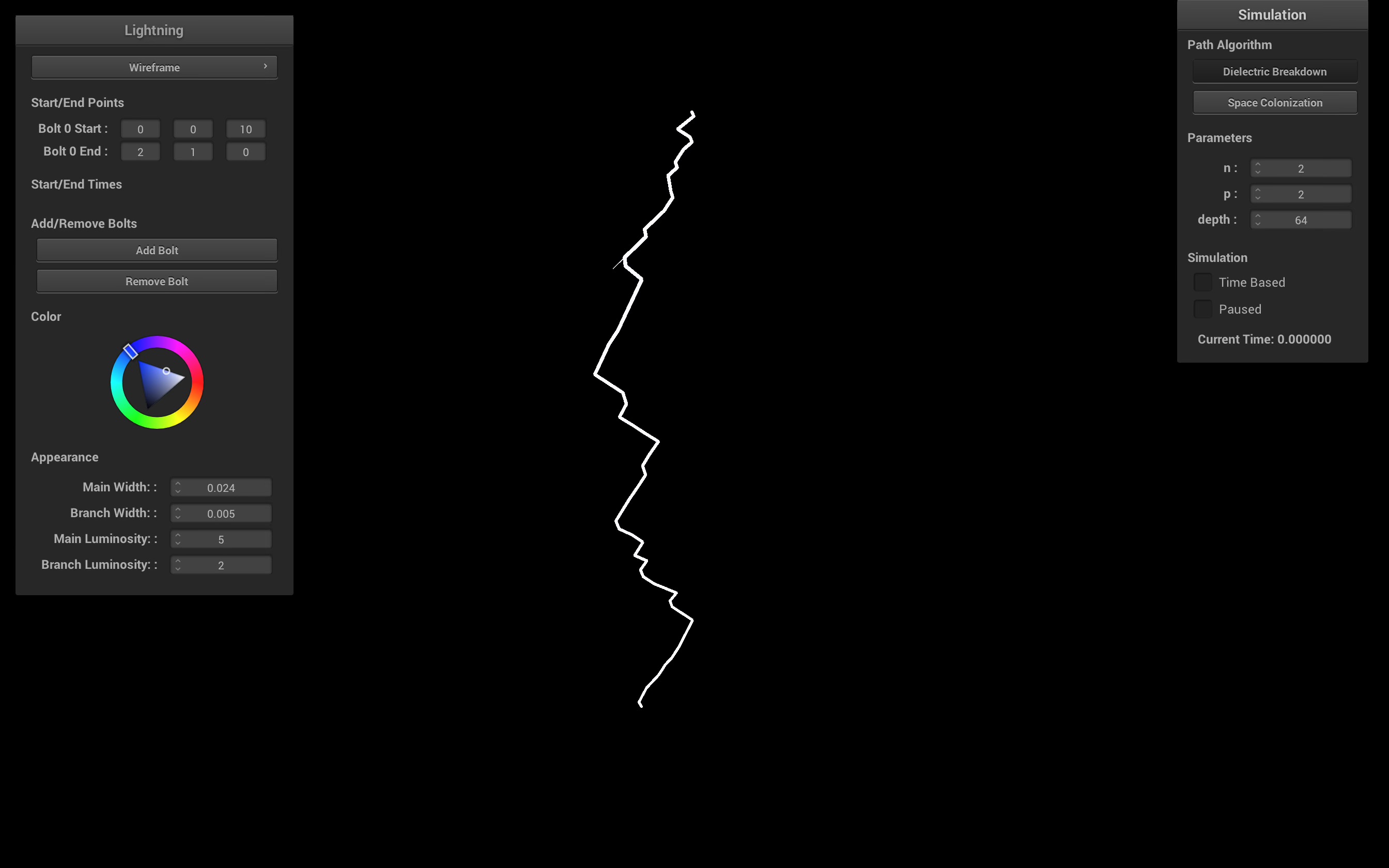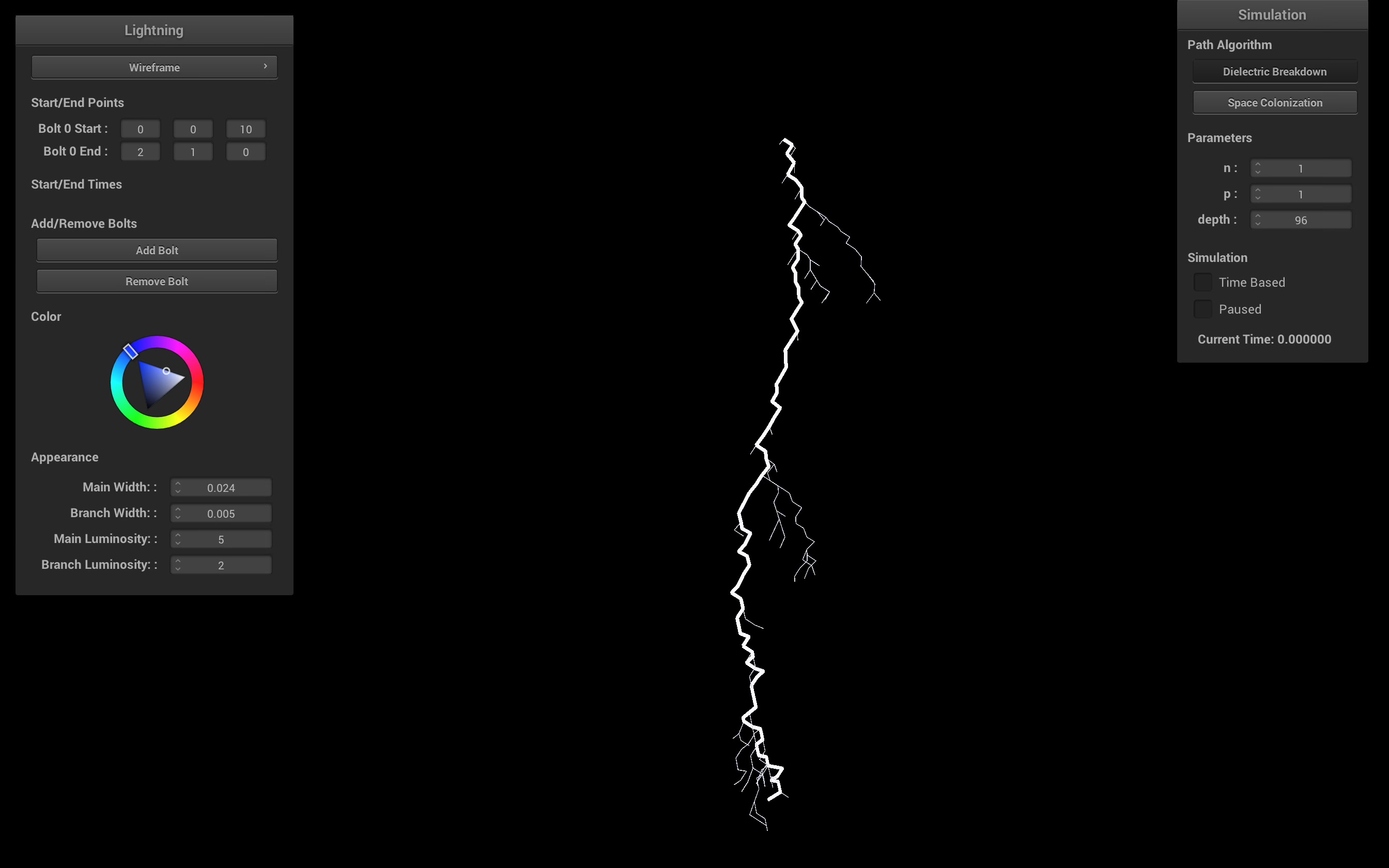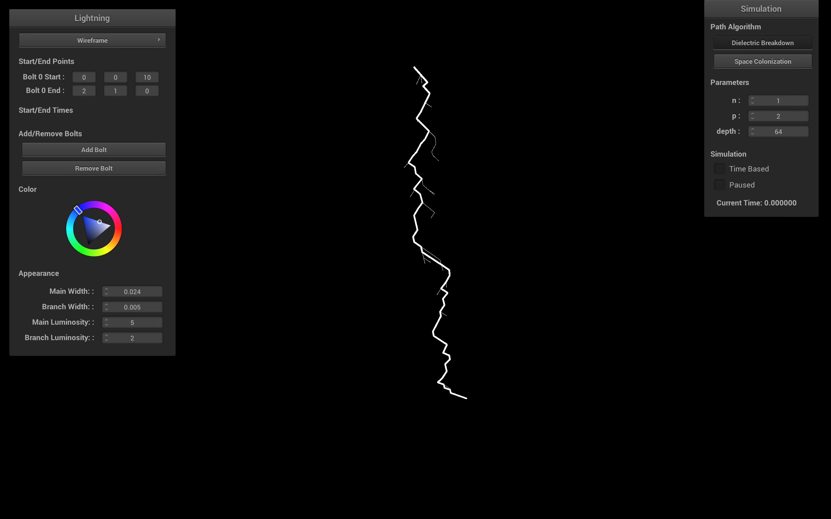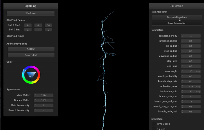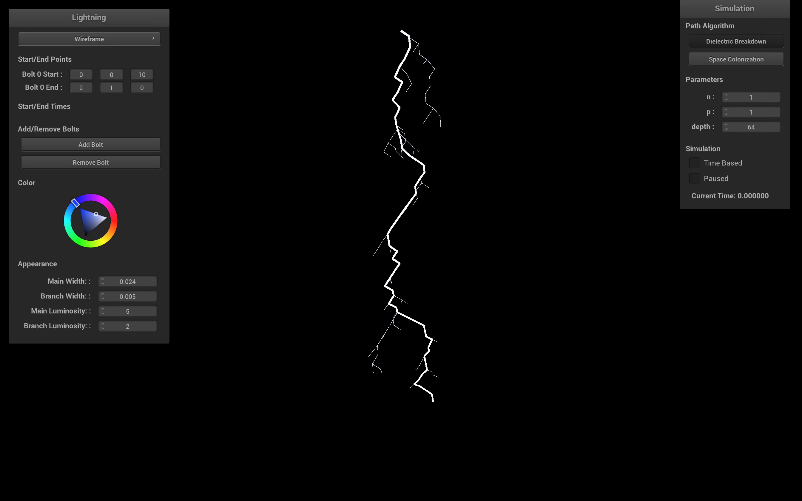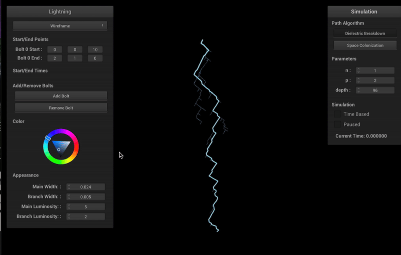 Our GUI supports changing the algorithm type, modifying all their parameters, adding multiple lightning bolts, changing their start and end points, time-based simulation events, luminosity, width, and even color.