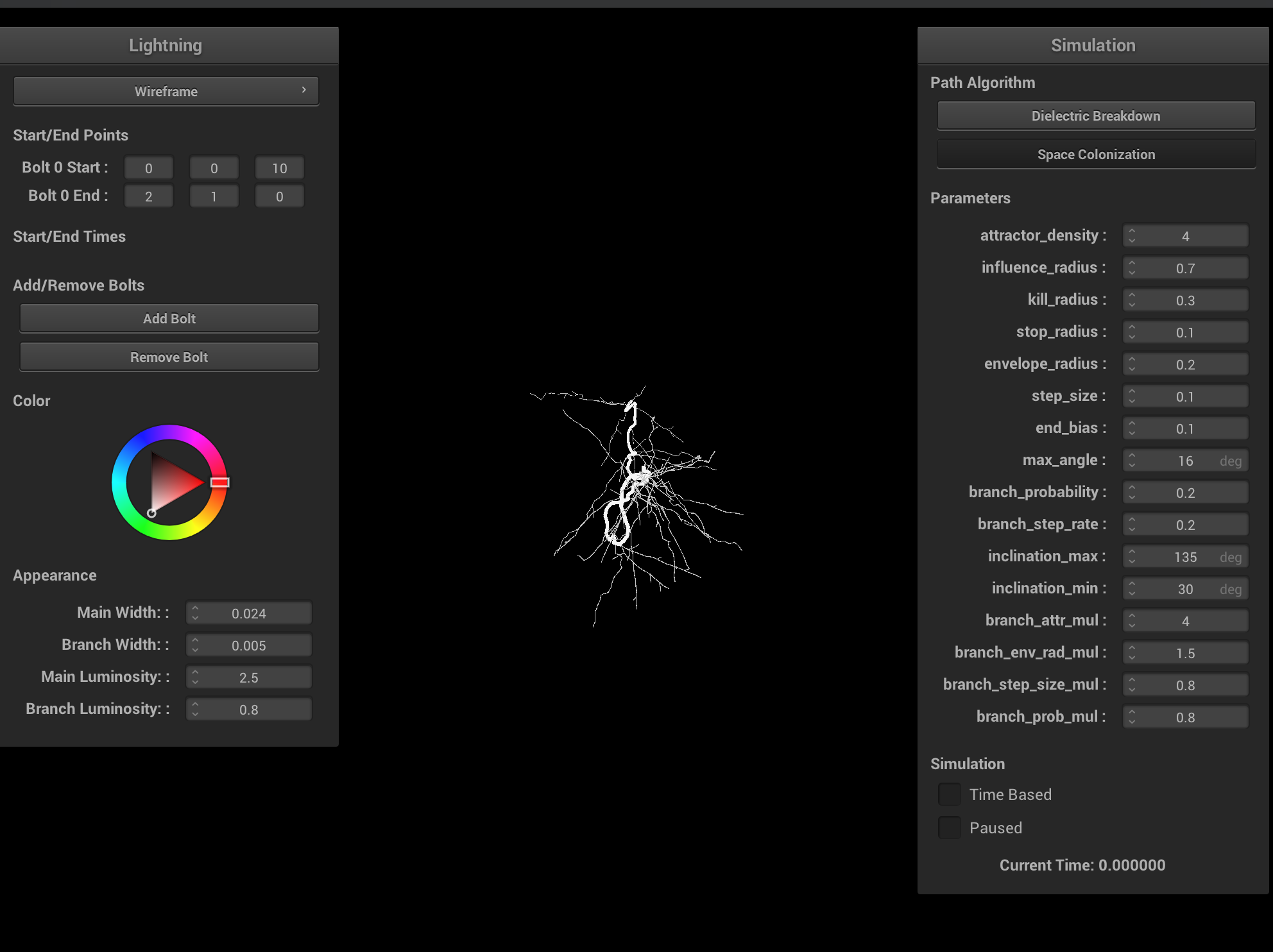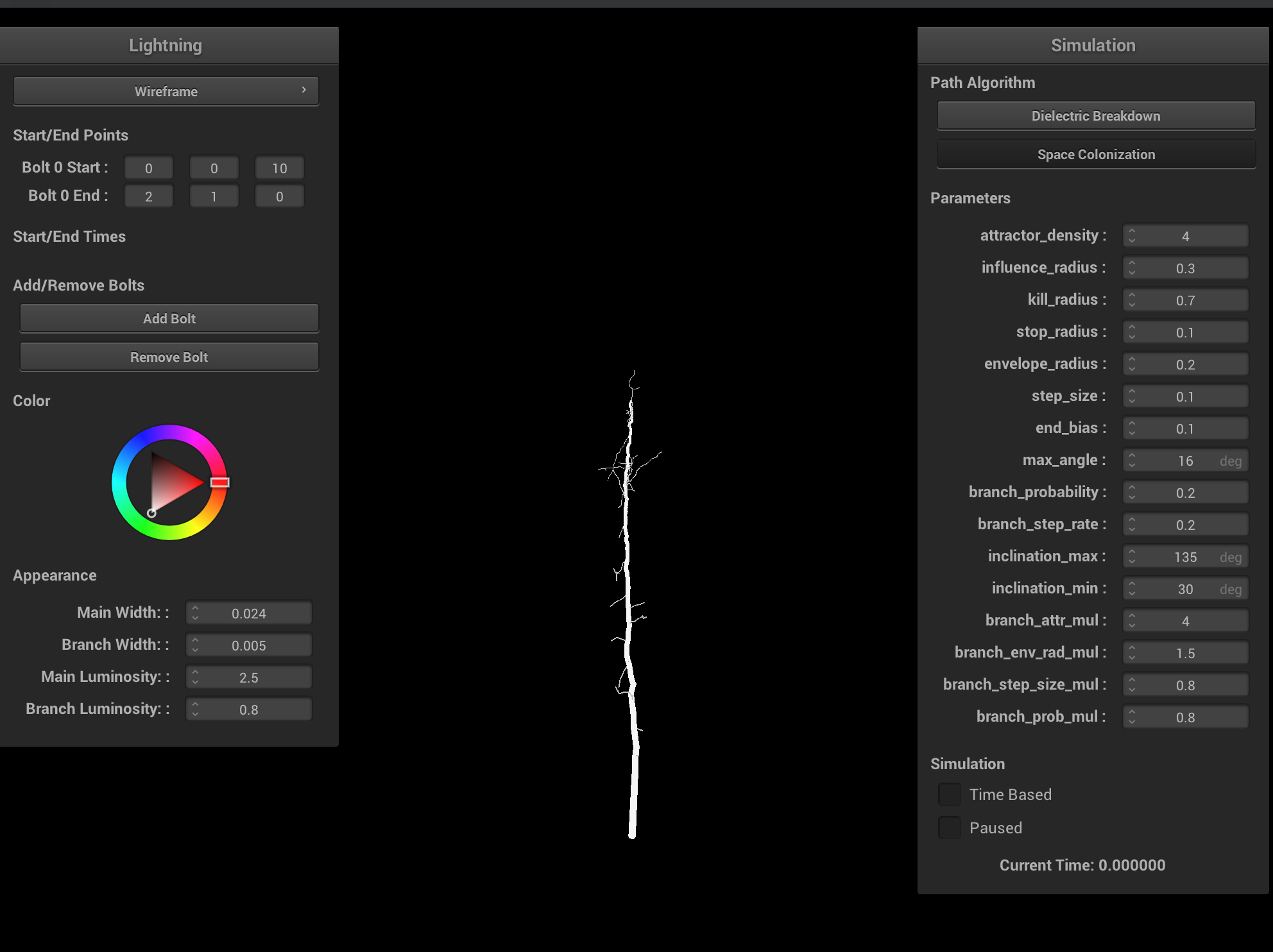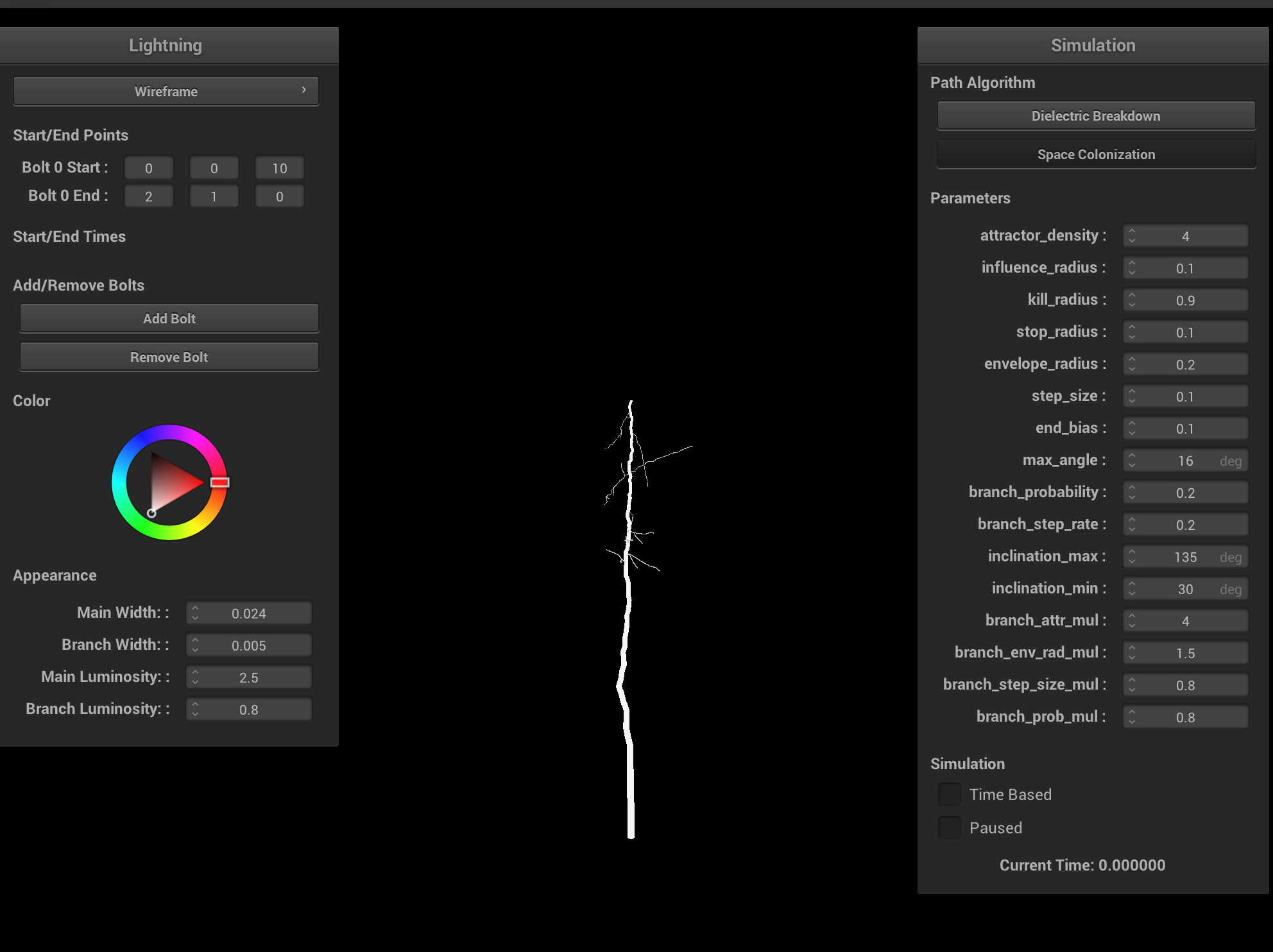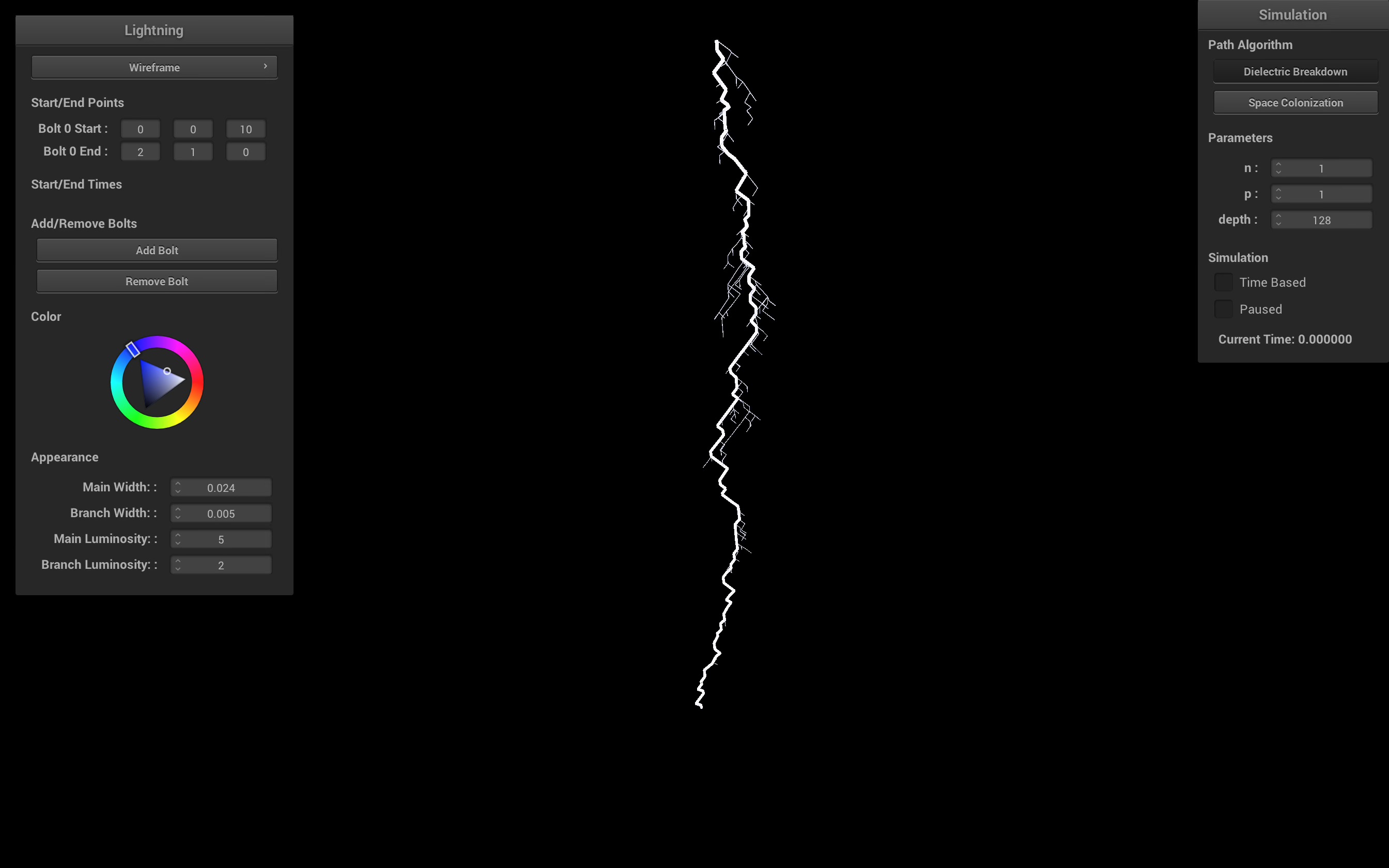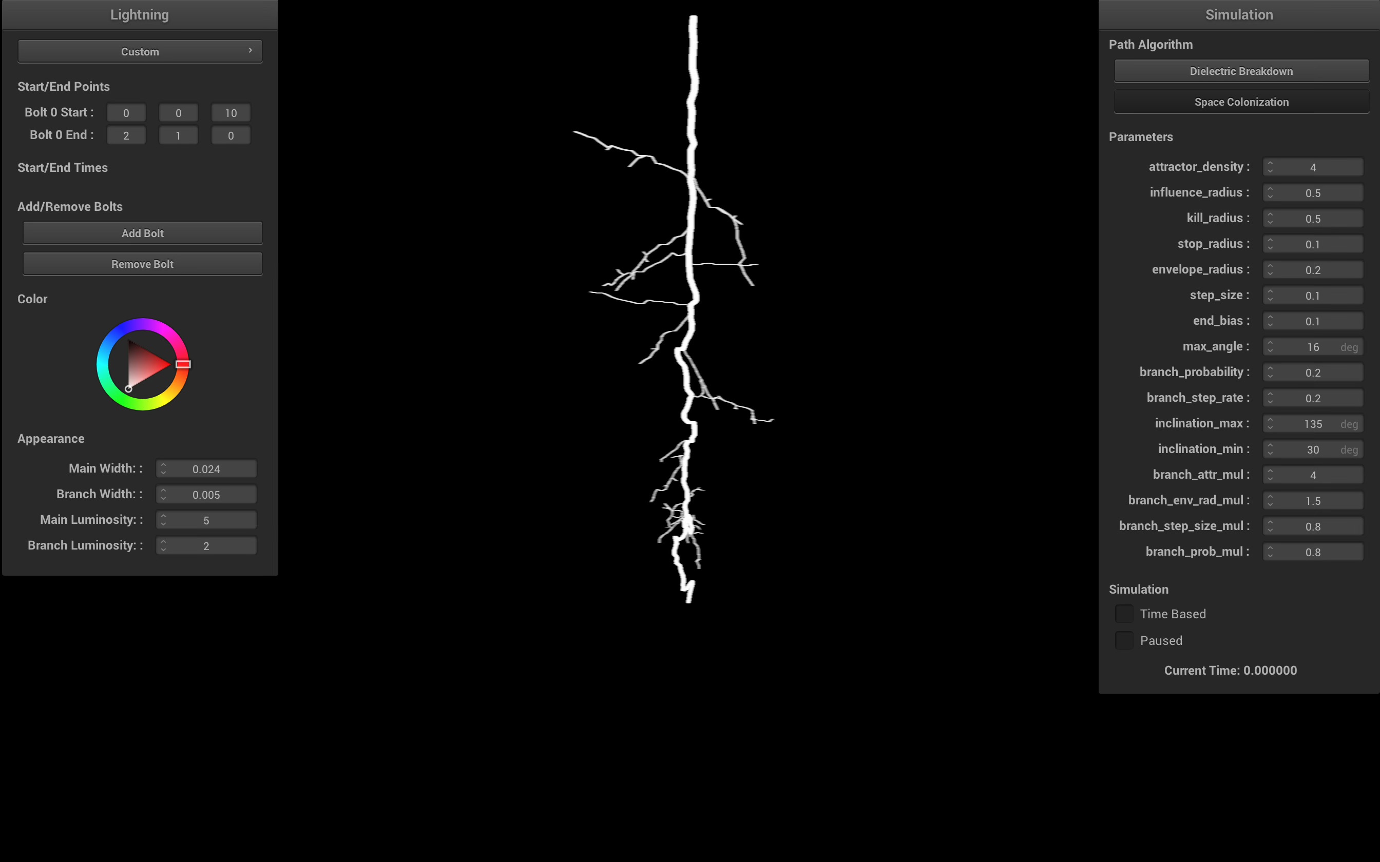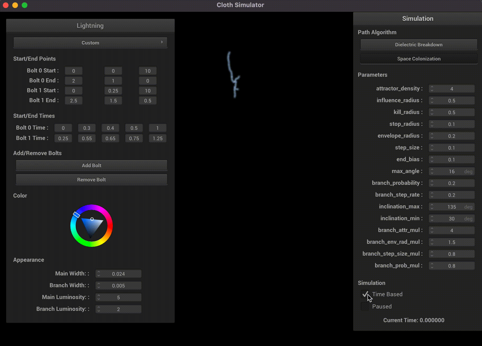 Our GUI supports changing the algorithm type, modifying all their parameters, adding multiple lightning bolts, changing their start and end points, time-based simulation events, luminosity, width, and even color.