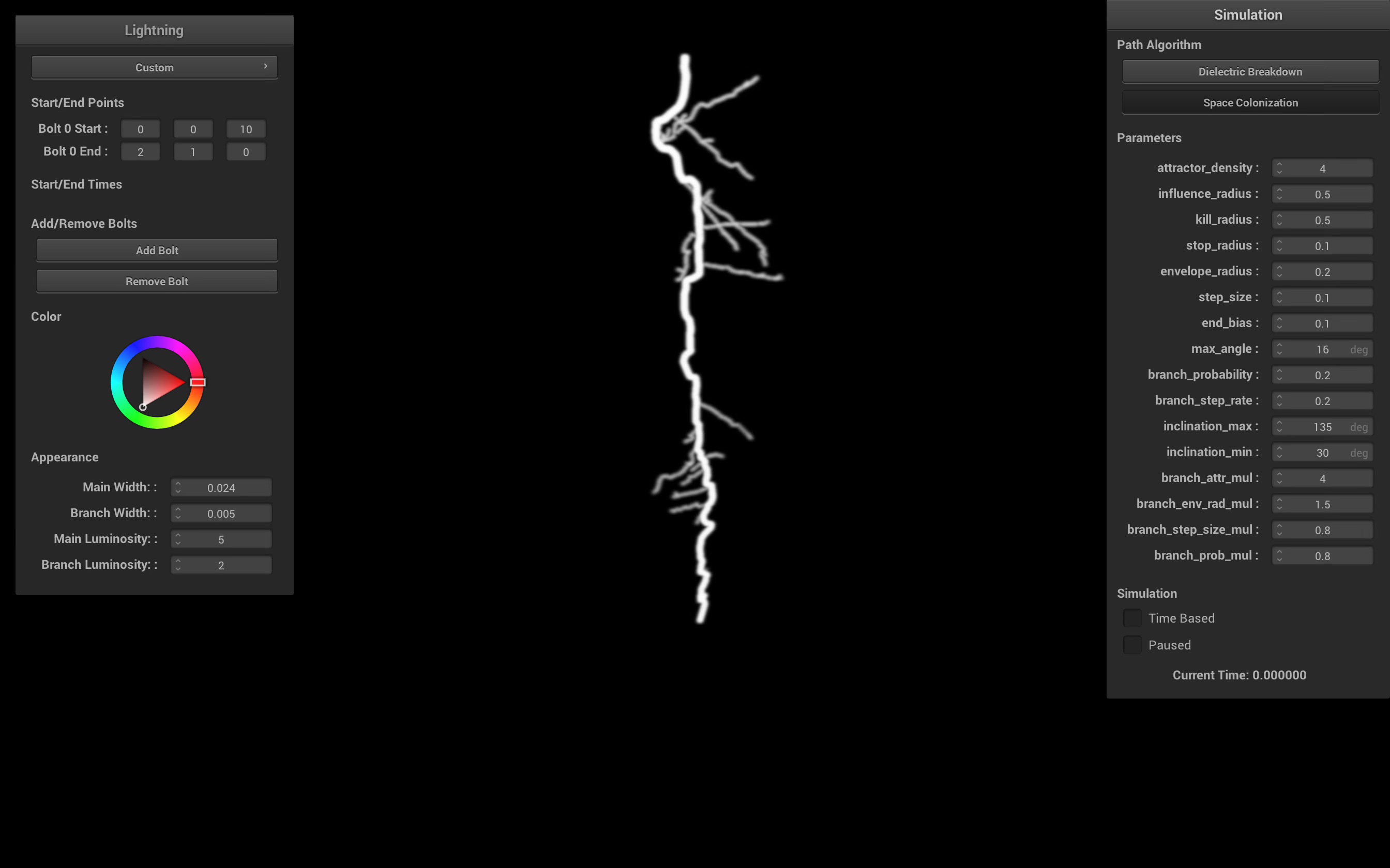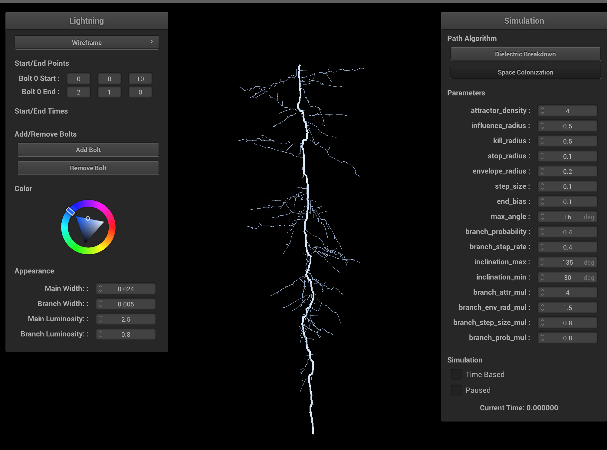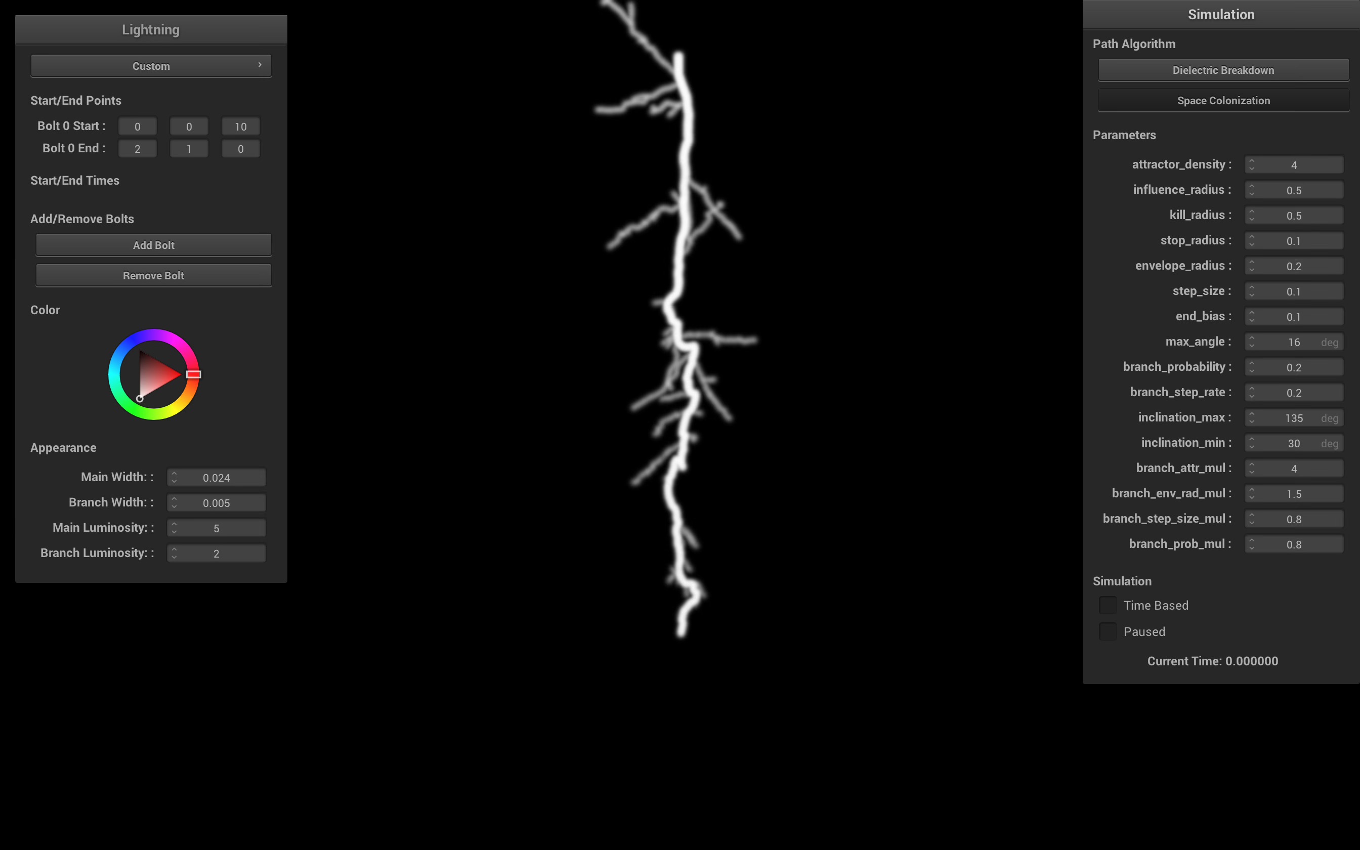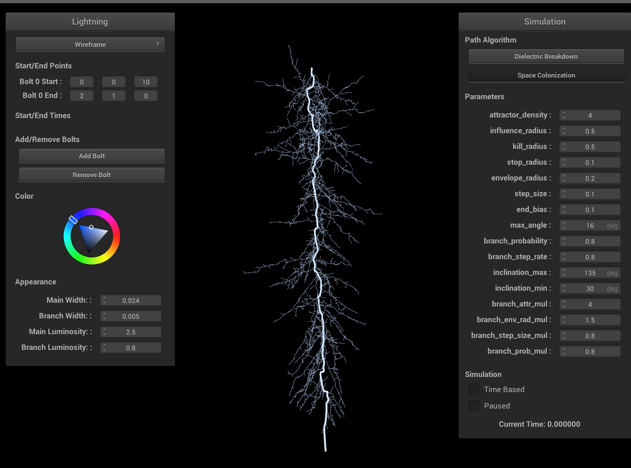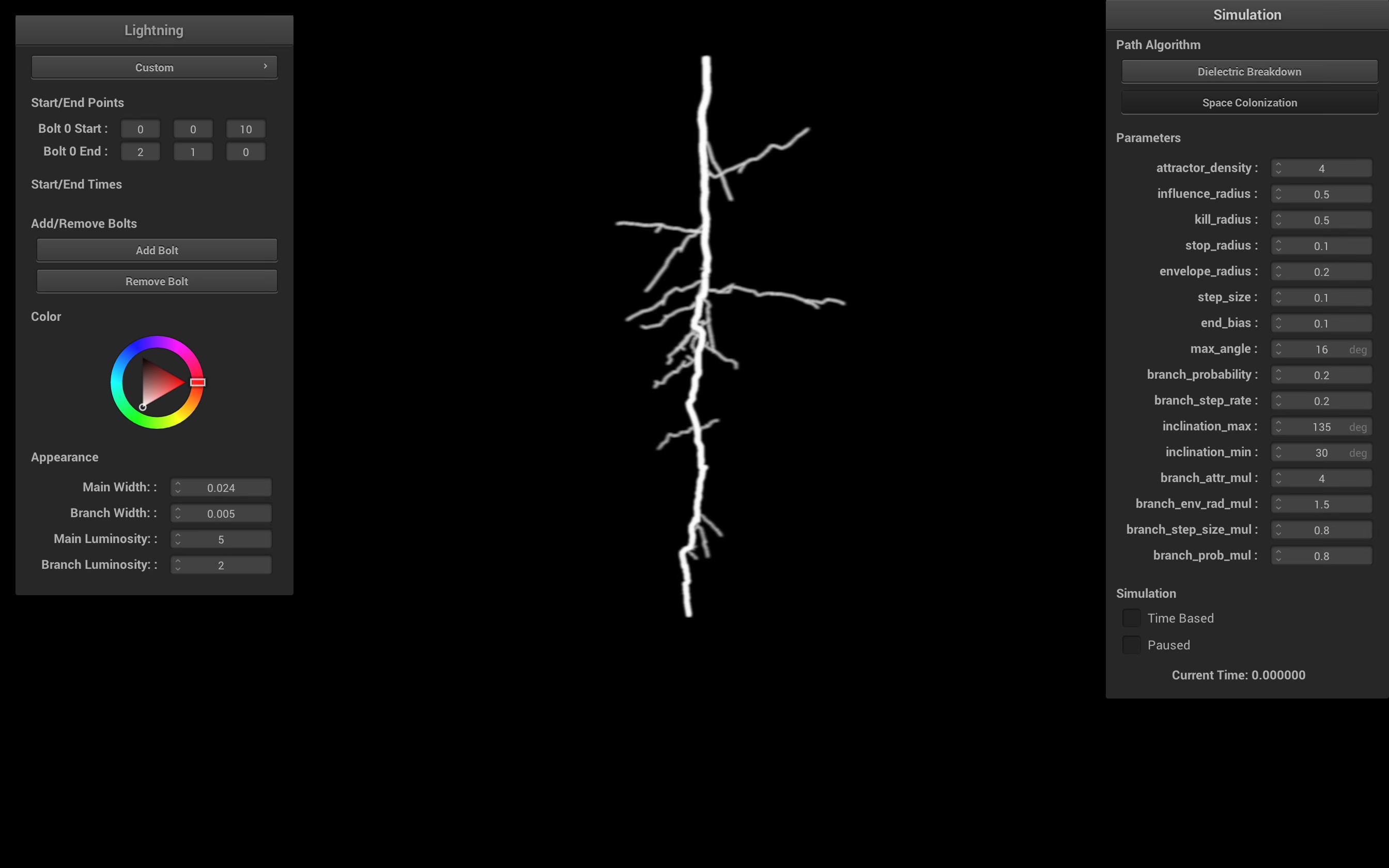 Our GUI supports changing the algorithm type, modifying all their parameters, adding multiple lightning bolts, changing their start and end points, time-based simulation events, luminosity, width, and even color.