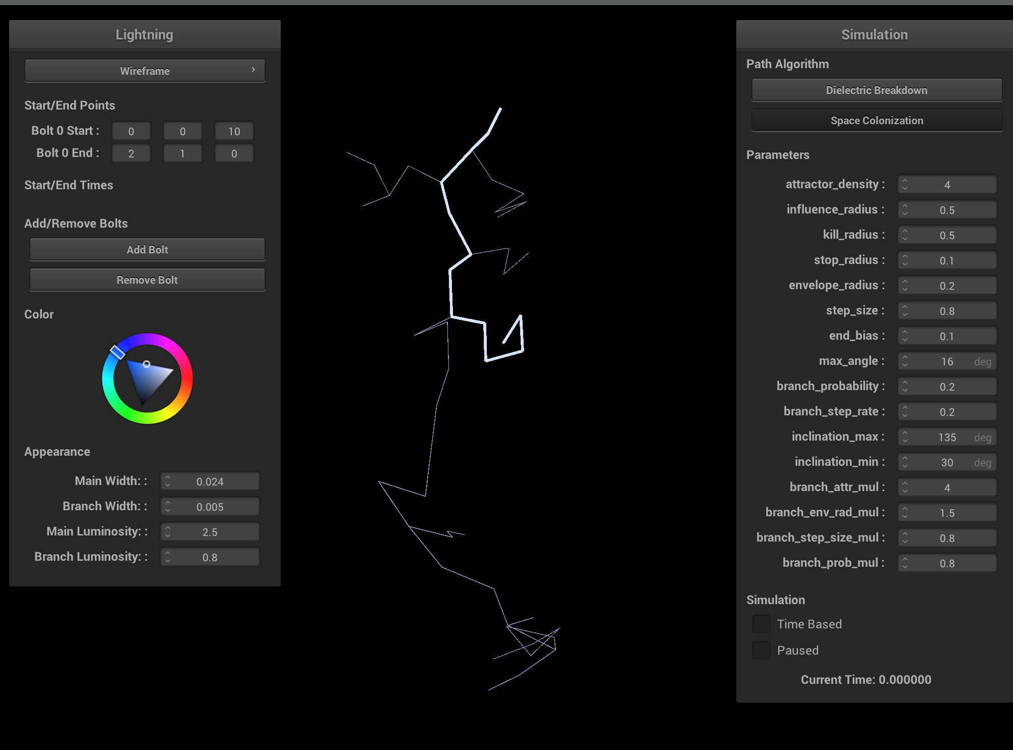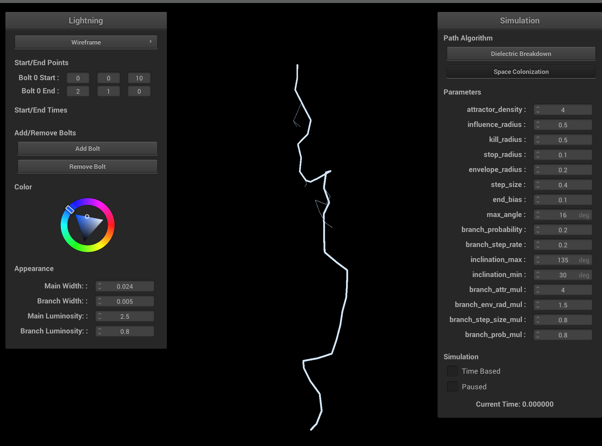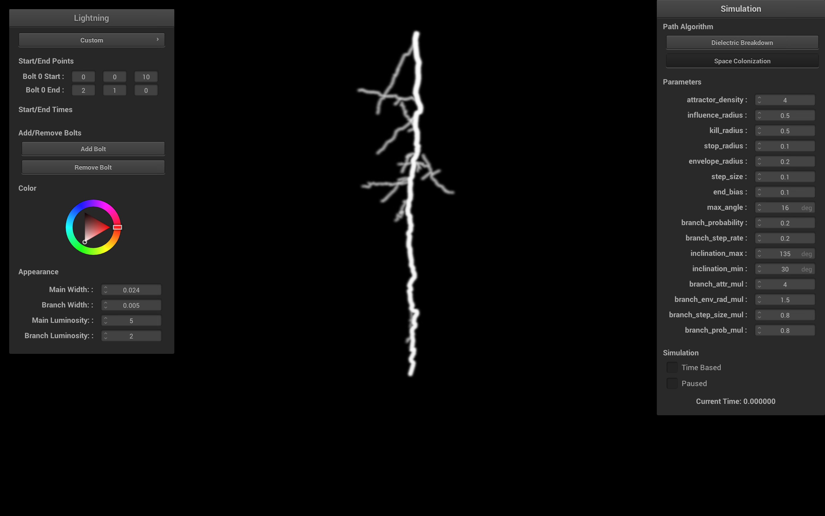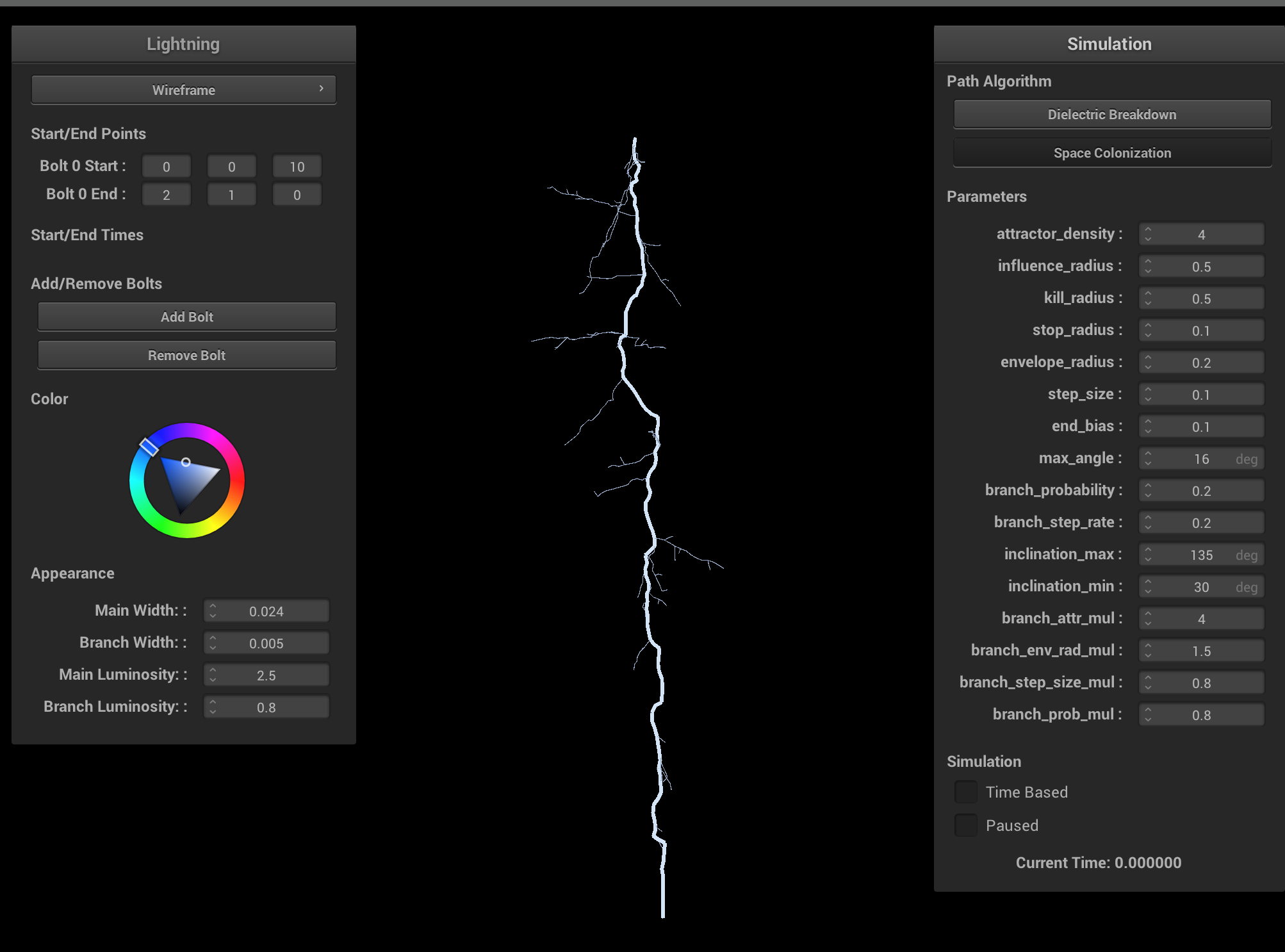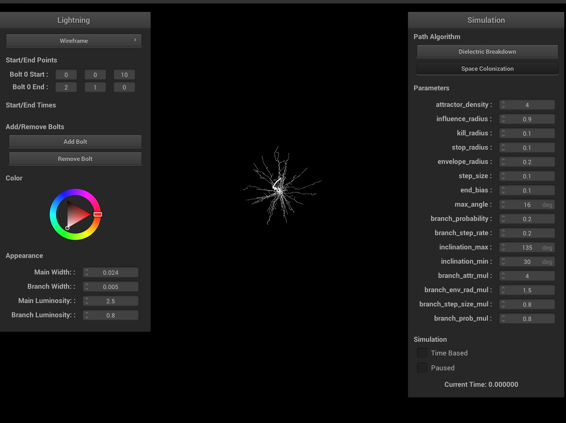Our GUI supports changing the algorithm type, modifying all their parameters, adding multiple lightning bolts, changing their start and end points, time-based simulation events, luminosity, width, and even color.