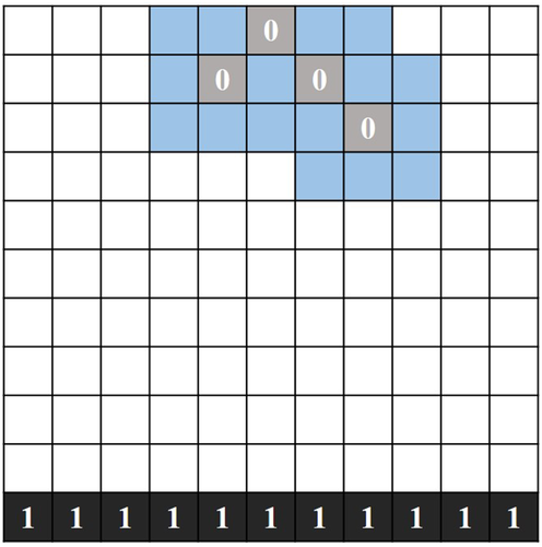 This 2D graphic that shows the negative path (grey), positive ground (black), and boundary cells (blue) [2].