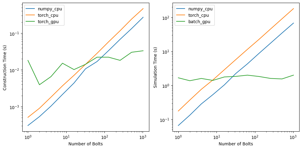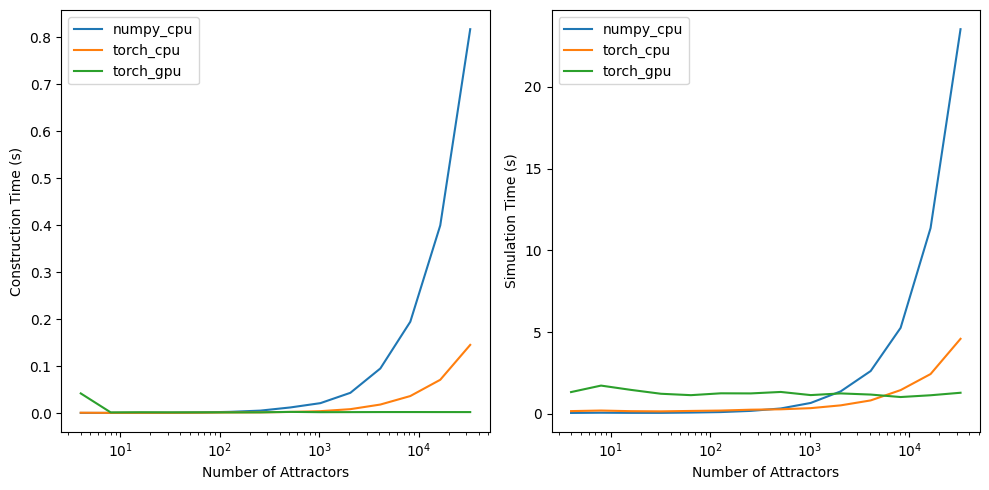 For methods (1) and (2), this would have involved very time-consuming rewrites, debugging, and learning foreign C/C++ libraries. Although method (3) has overhead passing data and structures between C++ and Python, on top of Python specific overhead (global interpreter lock, lack of multithreading, etc.), we wanted to leverage the already existing SIMD and vectorized speedups that both NumPy and PyTorch offer without adding too much complexity. We wrote a general framework, ComputeBackend, which abstracts away switching between NumPy arrays and PyTorch tensors, and can automatically select the best device. According to the timing analysis below, NumPy using CPU is almost always preferred for the space colonization algorithm, and is always preferred for the fast DBM algorithm due to its highly sequential nature.