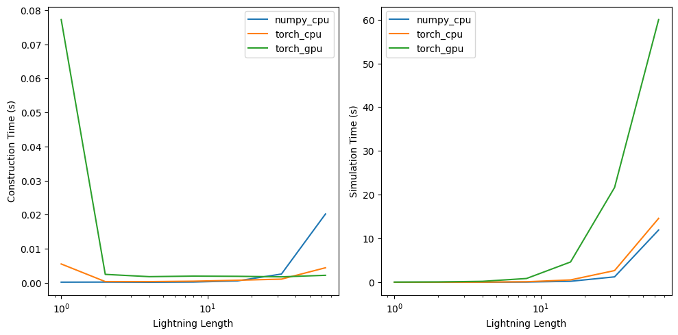 Timing analysis of different methods varying different parameters, highlighting the strengths of each acceleration method. Increasing the attractor density highlights the efficiency of PyTorch's masking operations and sparse Tensor operations, even when running on CPU. Increasing the length of the bolt makes the algorithm more sequential in nature, demonstrating the effectiveness of NumPy's vectorization schemes. GPU simulation time does not increase, even with an extremely high number of lightning bolts. Experiments were run using a Ryzen 5 3600 equipped with a NVIDIA RTX 3060, running Ubuntu 20.04.