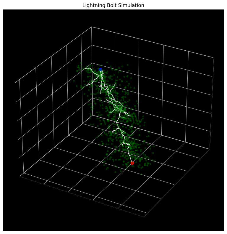This is a visualization of the full volume of attractor points, branches, and resulting lightning path generation. Once the initial cylinder of attractors is generated, the algorithm deterministcally finds the main path.