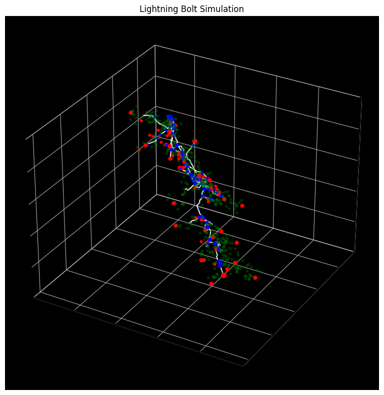The space colonization model is based on a 2022 paper on realistic lightning simulation [4], with several modifications and improvements to ground the algorithm based on the metastable model. Given start and end points, we randomly fill a cylindrical volume between the two points with attractors. The stepped leader of the lightning travels in a direction based on a weighted sum of nearby attractors, which models the distribution of metastable accumulation. In order to maintain the principle of minimum energy, attractors that are too close to the lightning leader are removed.